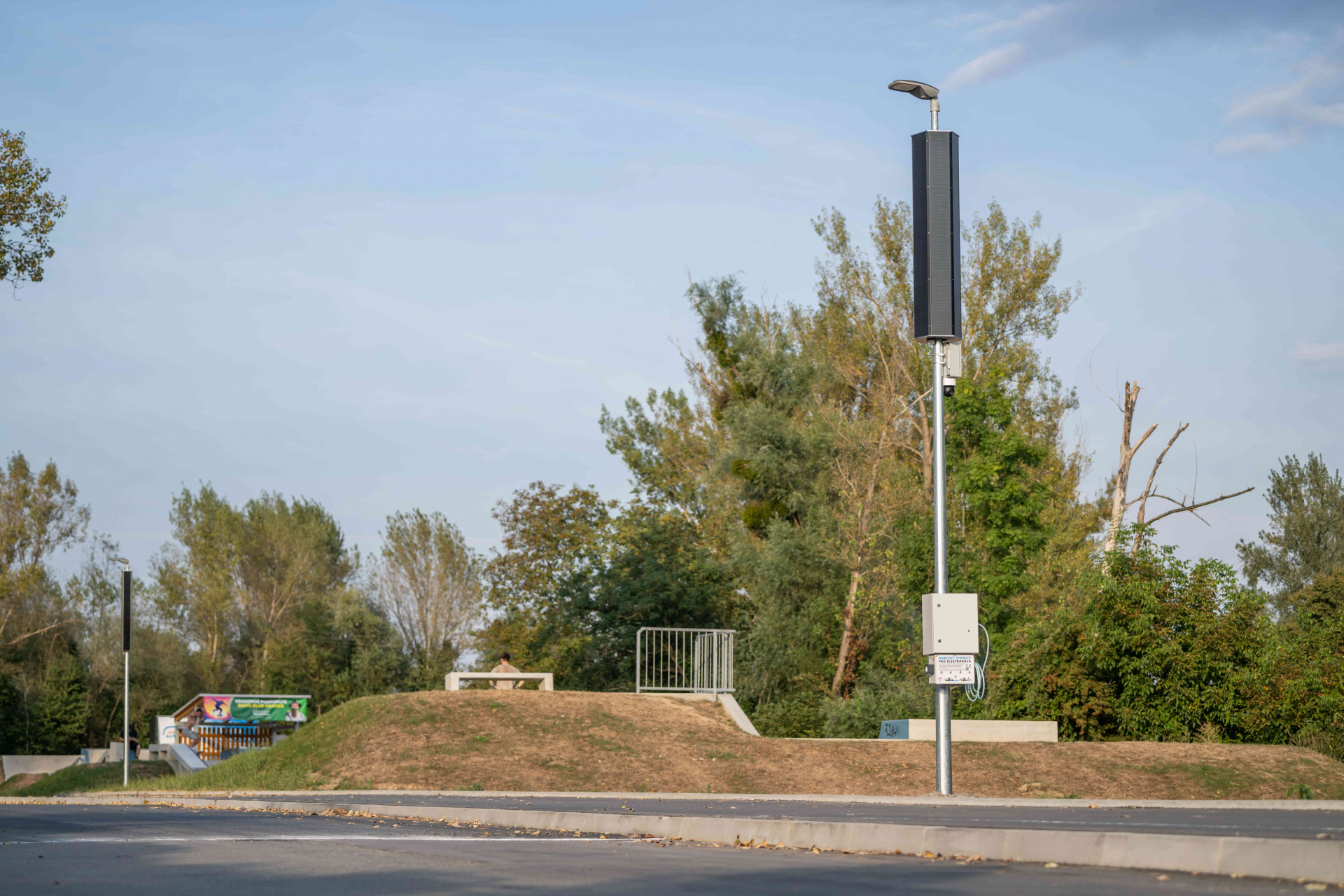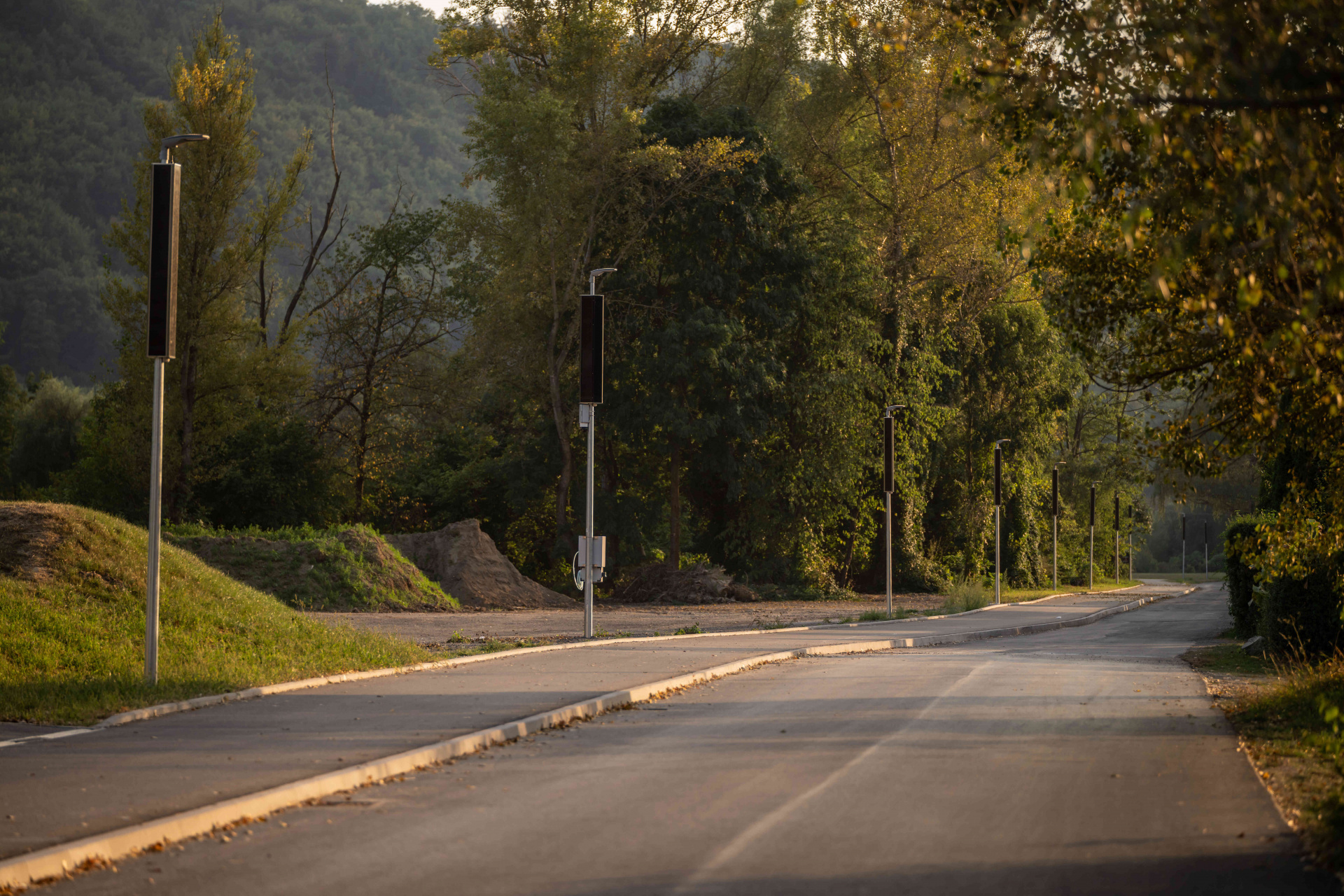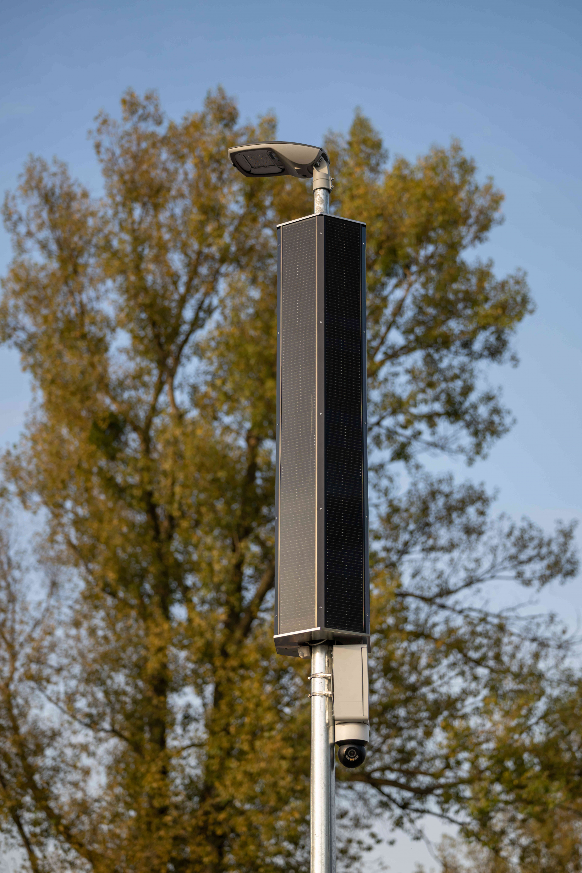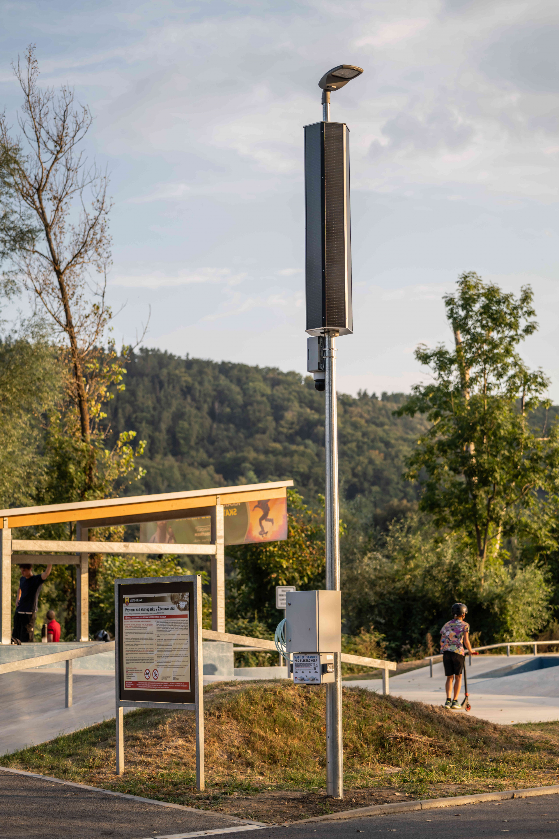 The light is equipped with hexagonal solar panels and can be fitted with smart components that enable motion detection and intelligent switching on of other lights in the row only when needed. This significantly saves energy and extends autonomous operation. It is also possible to integrate a camera system, charging stations for electric bikes, electrical sockets, or a compressor for inflating tires. This combination turns the lamp into a multifunctional element of public space, ideal especially for bike paths, recreational trails, parks, and smart cities.